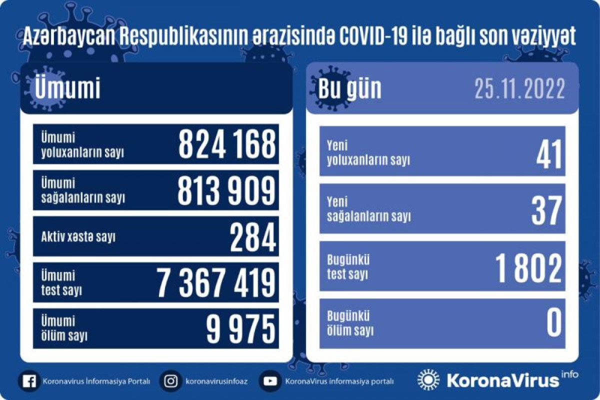 Azərbaycanda koronavirus (COVID-19) infeksiyasına 41 yeni yoluxma faktı qeydə alınıb, 37 nəfər müalicə olunaraq sağalıb.