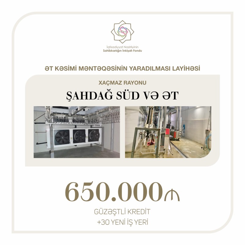 Sahibkarlığın İnkişafı Fondu tərəfindən "Şahdağ Süd və Ət" MMC-yə kəsim məntəqəsinin yaradılması layihəsi üzrə 650 min manat güzəştli kredit ayrılıb.