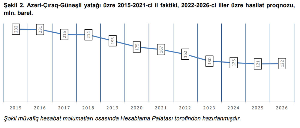 “Azəri-Çıraq-Günəşli yatağı üzrə son illərin proqnoz göstəricilərinin müqayisəsi nəticəsində 2015-ci ilin hasilat proqnozu ilə 2023-cü ilin hasilat proqnozu arasında təqribən 102,0 mln. barel və ya 44,0% azalma müşahidə edilmişdir. Təqdim edilmiş proqnoz göstəricilərinə əsasən azalma tendensiyasının növbəti illərdə də davam etməsi gözlənilir ki, ortamüddətli proqnozda neftin qiymətinin 2023-cü ilin göstəricisi ilə sabit götürülməsi halında bu mənbə üzrə Fondun gəlirlərinin kəskin azalması ehtimalı yaranır.