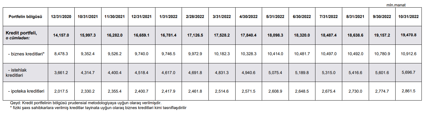 Cəmi kredit portfelinin 10 milyard 912.6 milyon manatı biznes kreditlərinin, 5 milyard 696.7 milyon manatı istehlak kreditlərinin, 2 milyard 861.5 milyon manatı ipoteka kreditlərinin payına düşüb.