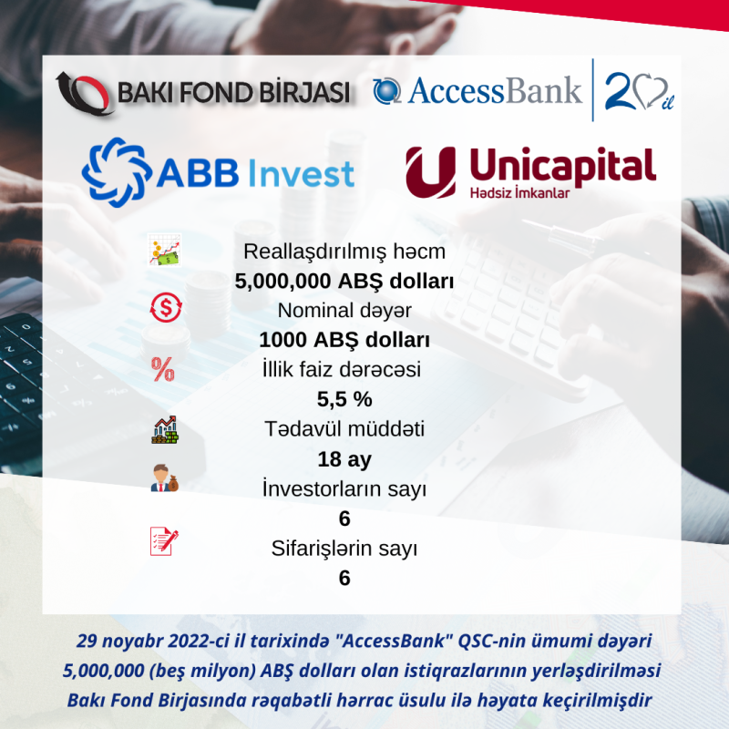 29 noyabr 2022-ci il tarixində Bakı Fond Birjasında "AccessBank" QSC-nin tədavül müddəti 18 ay, nominal dəyəri 1000 ABŞ dolları olan AZ2004004282 dövlət qeydiyyat nömrəli, 5 milyon ABŞ dolları həcmində, faizli, təmin edilməmiş sənədsiz, adlı istiqrazlarının (Aqrar İnkişaf İstiqrazları) yerləşdirilməsi üzrə hərrac yekunlaşıb.
