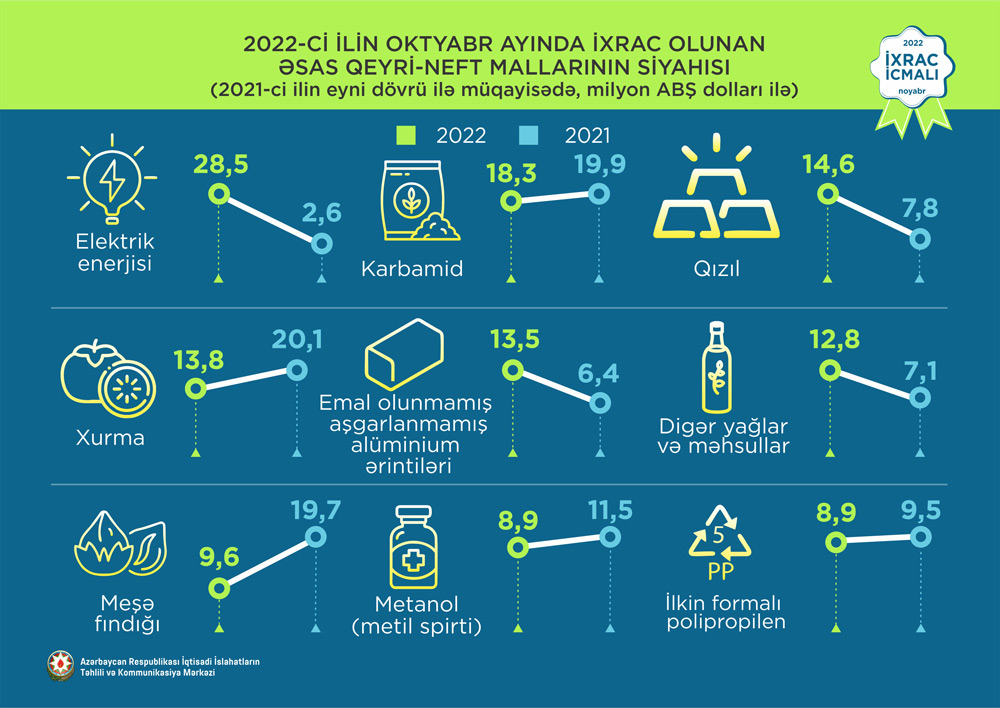 2022-ci ilin oktyabr ayında ixrac edilən qeyri-neft sektoruna aid malların siyahısında elektrik enerjisi (28,5 milyon ABŞ dolları) birinci, karbamid (18,3 milyon ABŞ dolları) ikinci və qızıl (14,6 milyon ABŞ dolları) üçüncü olub.