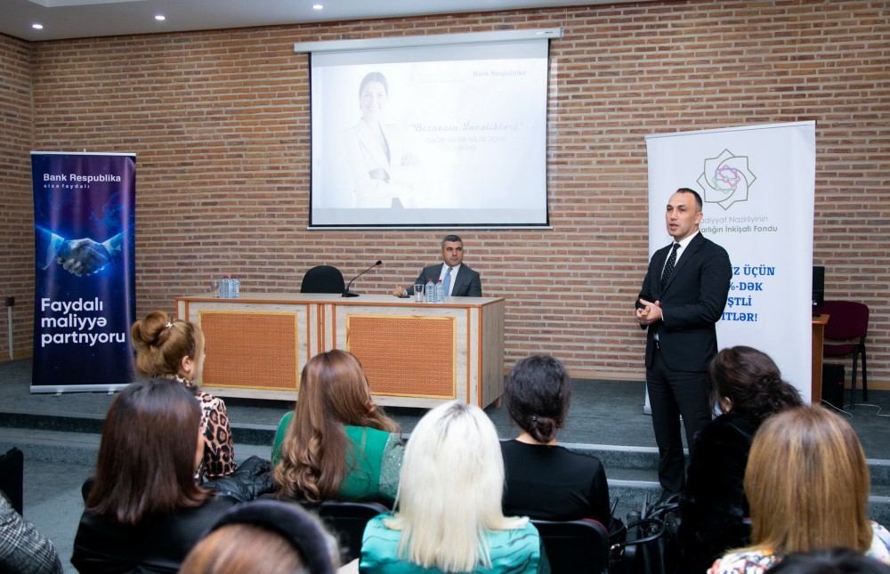 Gəncə şəhərində baş tutan tədbirdə Sahibkarlığın İnkişafı Fondunun sədri Osman Xaliyev və “Bank Respublika” İdarə Heyətinin sədri Tariyel İsmayılov çıxış edərək, qadınların sahibkarlığın inkişafındakı rolunu qeyd edib. Tədbir iştirakçılarına qadınların sahibkarlıq fəaliyyətlərinə dəstək verilməsi istiqamətində görülən işlər haqqında məlumat verilib.