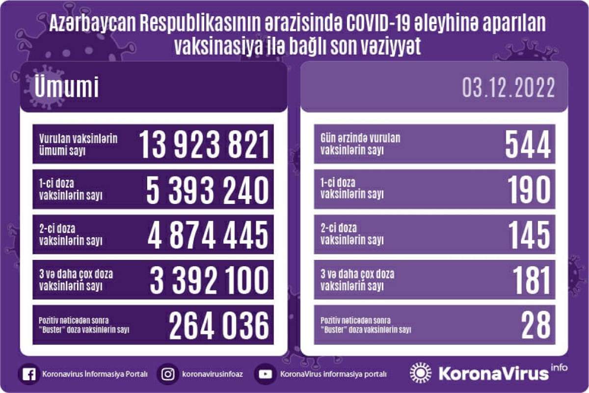 Azərbaycanda son sutkada koronavirus (COVID-19) əleyhinə 544 vaksin vurulub. Bir gündə birinci mərhələ üzrə vaksinasiya olunanların sayı 190, ikinci mərhələ üzrə vaksinasiya olunanların sayı 145, üç və daha çox doza üzrə vaksinasiya olunanların sayı 181, pozitiv nəticədən sonra buster doza üzrə vaksinasiya olunanların sayı 28 nəfərdir.