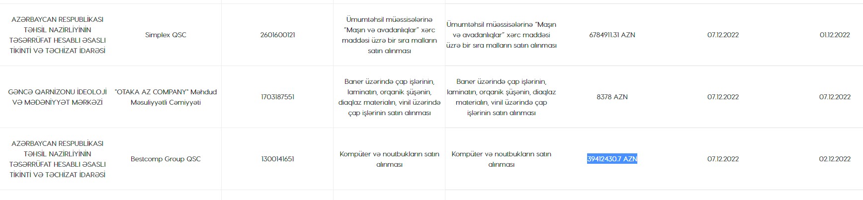 Həmçinin, Elm və Təhsil Nazirliyinin nəzdində təsərrüfat hesablı əsaslı Tikinti və Təchizat İdarəsi "Ümumtəhsil müəssisələrinə “Maşın və avadanlıqlar” xərc maddəsi üzrə bir sıra malların satın alınması" ilə bağlı keçirdiyi tenderi yekunlaşdırıb.