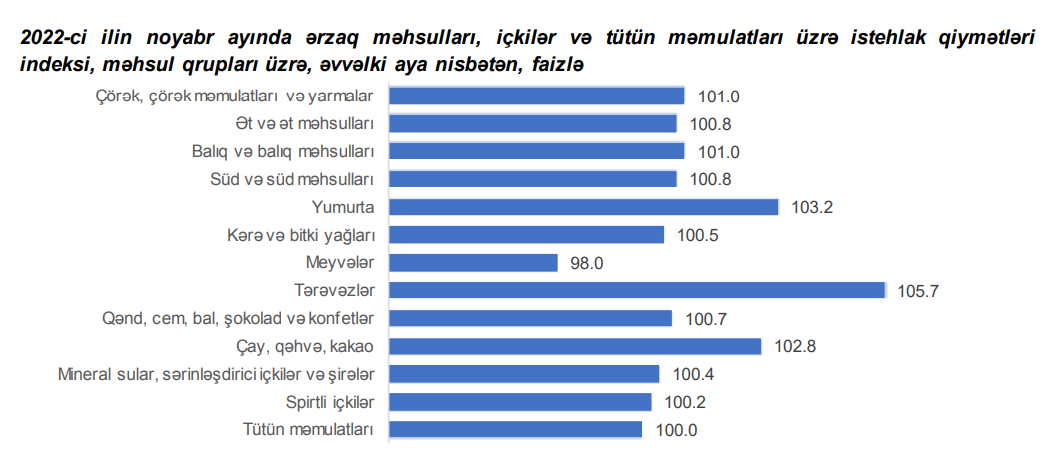 2022-ci ilin noyabr ayında ərzaq məhsulları, içkilər və tütün məmulatları üzrə istehlak qiymətləri indeksi əvvəlki aya nisbətən 1,2 faiz, əvvəlki ilin noyabr ayına nisbətən 20,1 faiz artıb (oktyabrda 21% artmışdı).