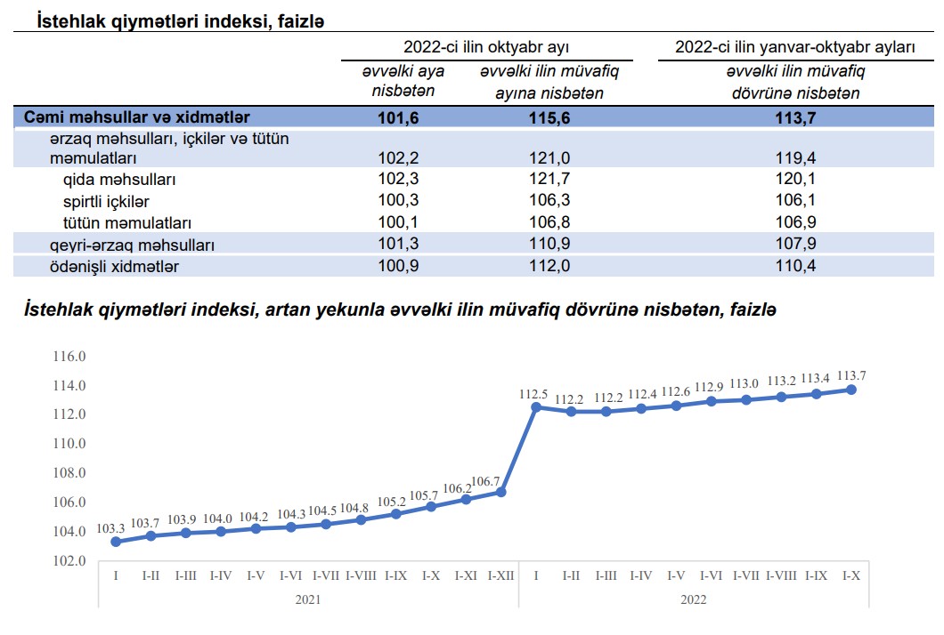 Xatırladaq ki, 2022-ci ilin yanvar-oktyabr aylarında istehlak qiymətləri indeksi (inflyasiya göstəricisi) 2021-ci ilin yanvar-oktyabr aylarına nisbətən 13,7 faiz artmışdı.