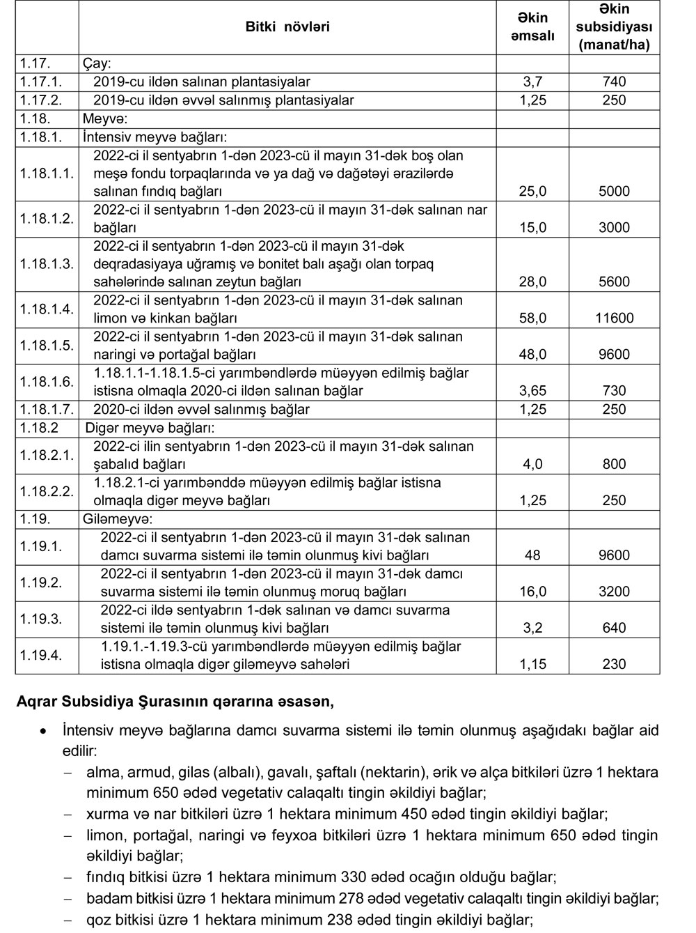 - 2022-ci il sentyabrın 1-dən 2023-cü il mayın 31-dək deqradasiyaya uğramış və bonitet balı aşağı olan torpaq sahələrində salınan intensiv zeytun bağlarının hər hektarına görə 5600 manat, boş olan Meşə Fondu torpaqlarında, dağlıq və dağətəyi ərazilərdə salınan intensiv fındıq bağlarının hər hektarına görə 5000 manat məbləğində əkin subsidiyası ödəniləcəkdir.