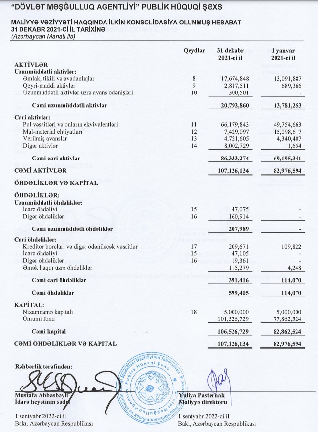 Bu il yanvarın 1-nə Dövlət Məşğulluq Agentliyinin aktivləri 107 milyon 126 min manat olub ki, bu da illik müqayisədə 29,1 % çoxdur. Hesabat dövründə agentliyin öhdəlikləri 5,3 dəfə arataraq 599 min manata, balans kapitalı isə 28,6 % arataraq 106 milyon 527 min manata çatıb.