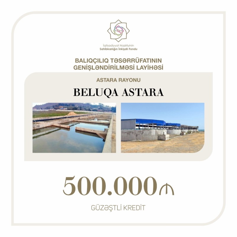Sahibkarlığın İnkişafı Fondu "Beluqa Astara" MMC-nin təqdim etdiyi balıqçılıq təsərrüfatının genişləndirilməsi layihəsinə 500 min manat güzəştli kredit ayırıb.