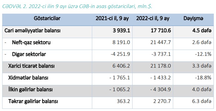 "2022-ci ilin 9 ayı üzrə tədiyə balansı əsasən qlobal əmtəə bazarlarında neft-qaz qiymətlərinin və qeyri-neft-qaz ixracının əhəmiyyətli artımından təsirlənmişdir. Cari əməliyyatlar balansında 17.7 milyard dollar profisit, kapital və maliyyənin hərəkəti hesabında isə 9.6 milyard dollar kəsir yaranmış, ehtiyat aktivləri 7.6 milyard dollar artmışdır. Bu dövrdə xam neftin orta qiyməti 107 dollar/barel olmuş, qeyri-neft-qaz ixracı isə 21.5% artaraq 2 milyard dollar səviyyəsində formalaşmışdır",- Hesabatda deyilir.