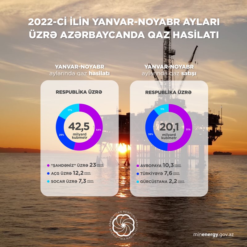 Energetika Nazirliyinin yaydığı məlumata görə, 2022-ci ilin yanvar-noyabr ayları üzrə operativ məlumatlara əsasən, Azərbaycanda 42,5 milyard kubmetr təbii qaz hasil edilib.