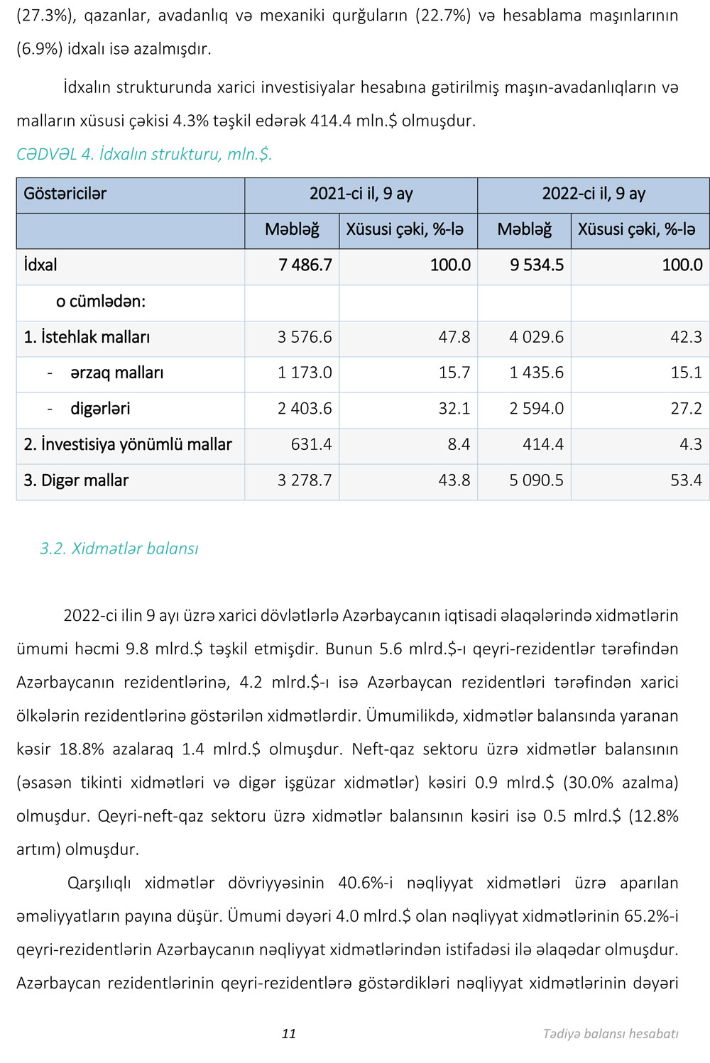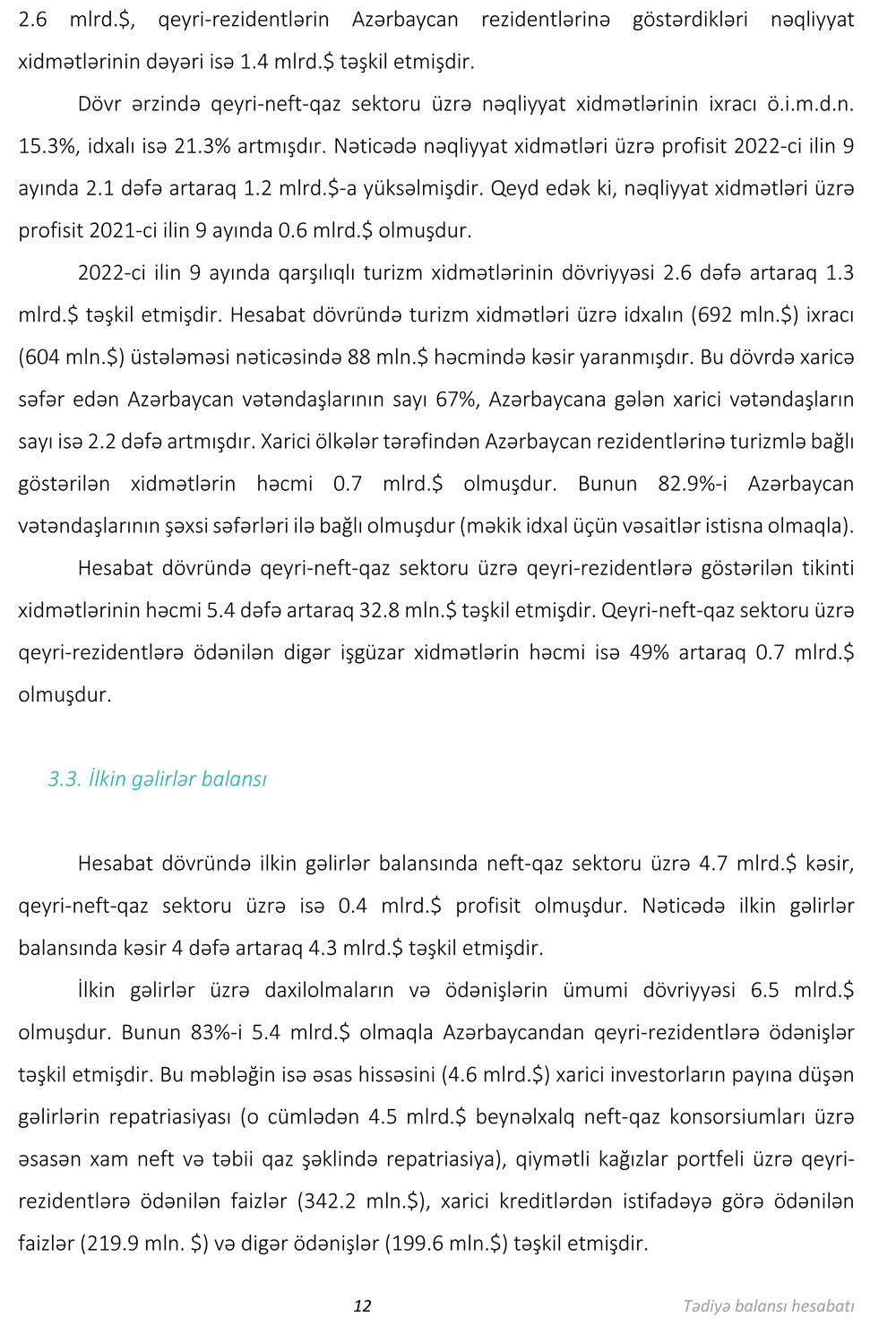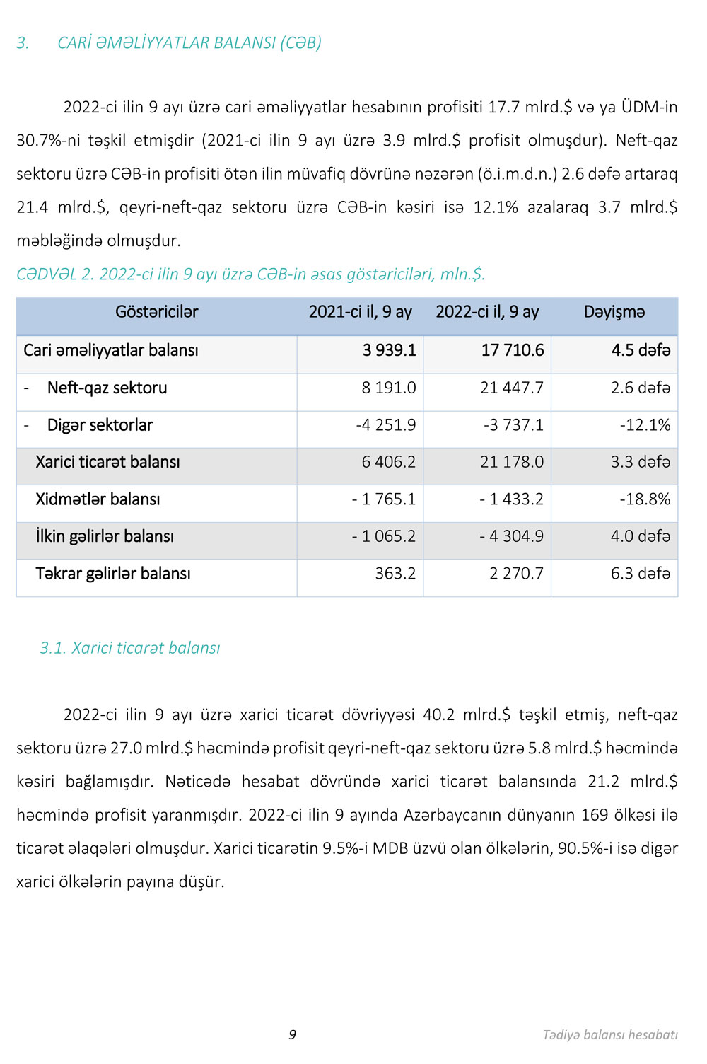 Qeyd edək ki, 2022-ci ilin 9 ayı üzrə tədiyə balansı əsasən qlobal əmtəə bazarlarında neft-qaz qiymətlərinin və qeyri-neft-qaz ixracının əhəmiyyətli artımından təsirlənmişdir. Cari əməliyyatlar balansında 17.7 milyard dollar profisit, kapital və maliyyənin hərəkəti hesabında isə 9.6 milyard dollar kəsir yaranmış, ehtiyat aktivləri 7.6 milyard dollar artmışdır. Bu dövrdə xam neftin orta qiyməti 107 dollar/barel olmuş, qeyri-neft-qaz ixracı isə 21.5% artaraq 2 milyard dollar səviyyəsində formalaşmışdır.