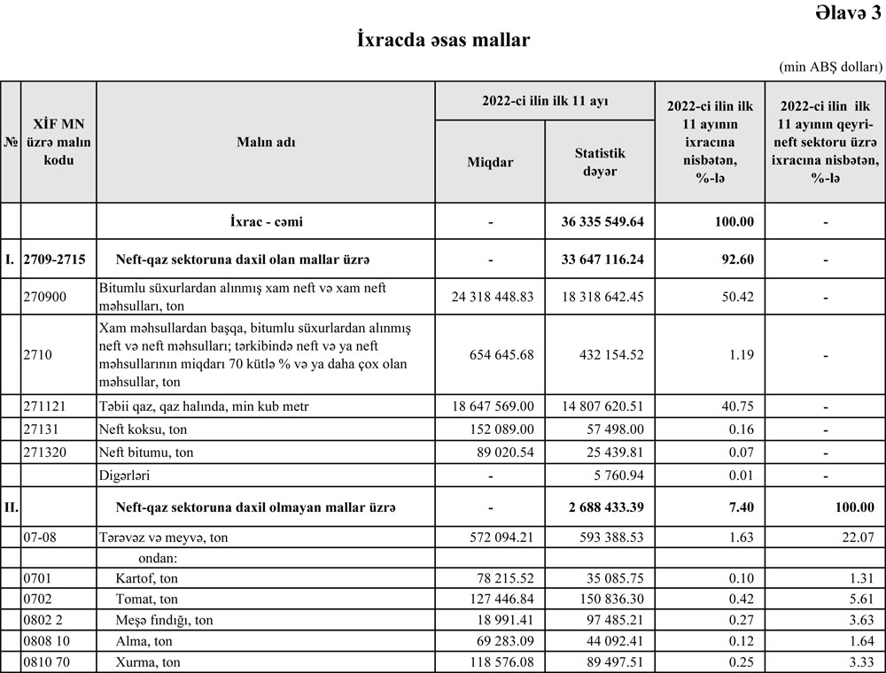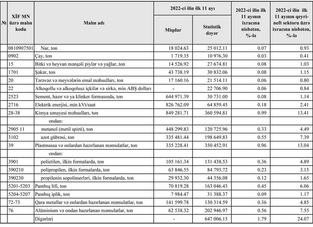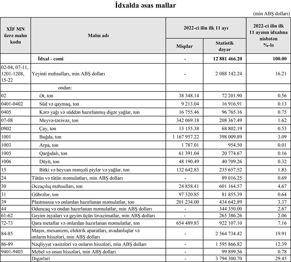2022-ci ilin 11 ayı ərzində (yanvar-noyabr) Azərbaycanın ən çox ixrac və idxal etdiyi mallar.