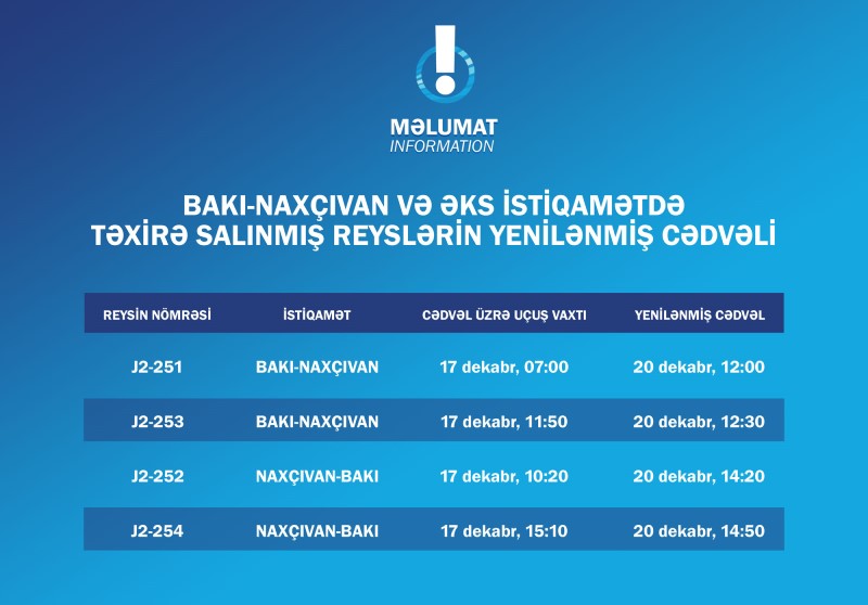 - Naxçıvan-Bakı marşrutu üzrə dekabrın 17-də təxirə salınmış J2-252 (saat 10:20) və J2-254 (saat 15:10) reyslərinin sərnişinləri bu gün, dekabrın 20-də müvafiq olaraq saat 14:20 və 14:50-də yola düşəcəklər.
