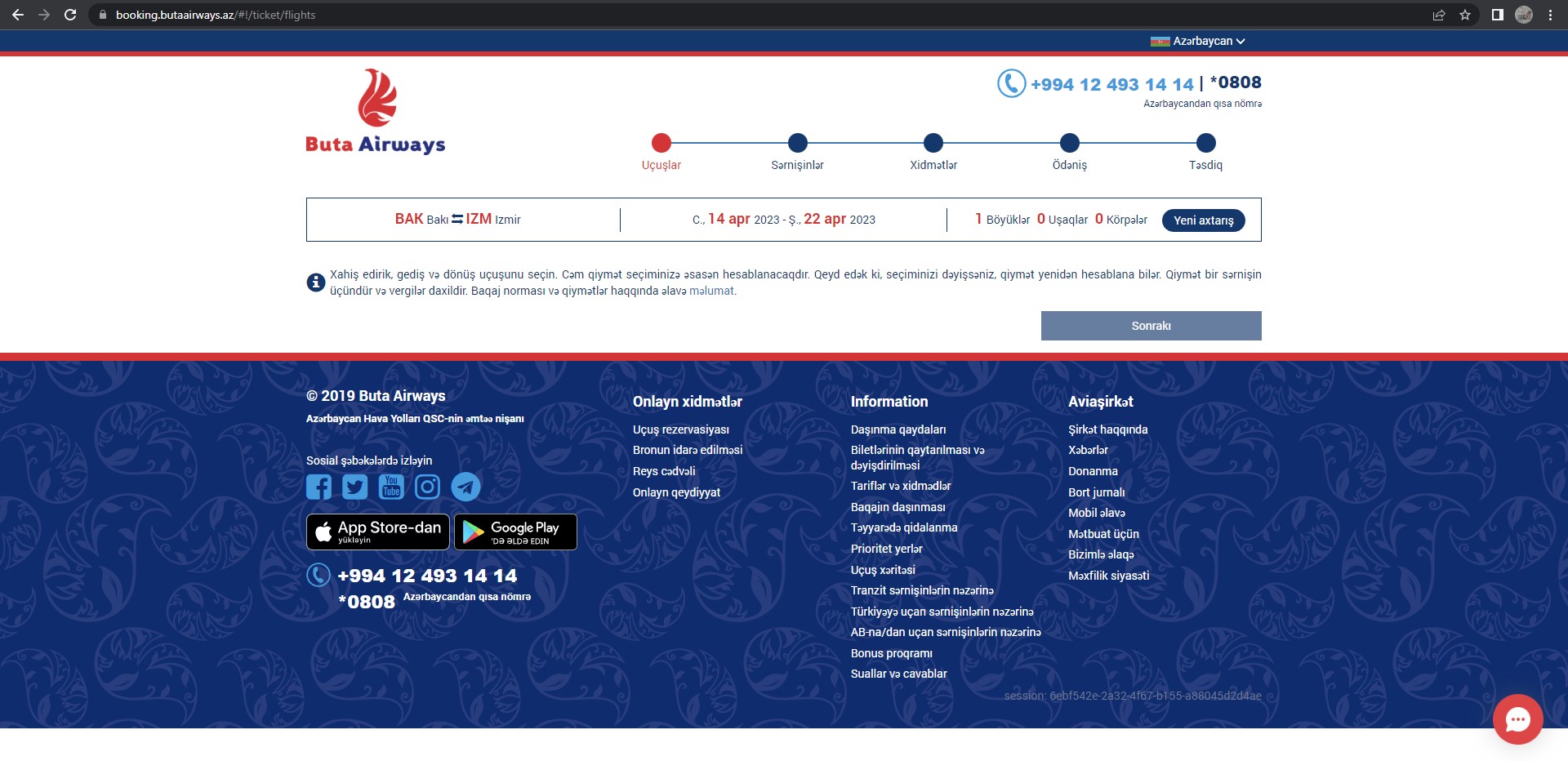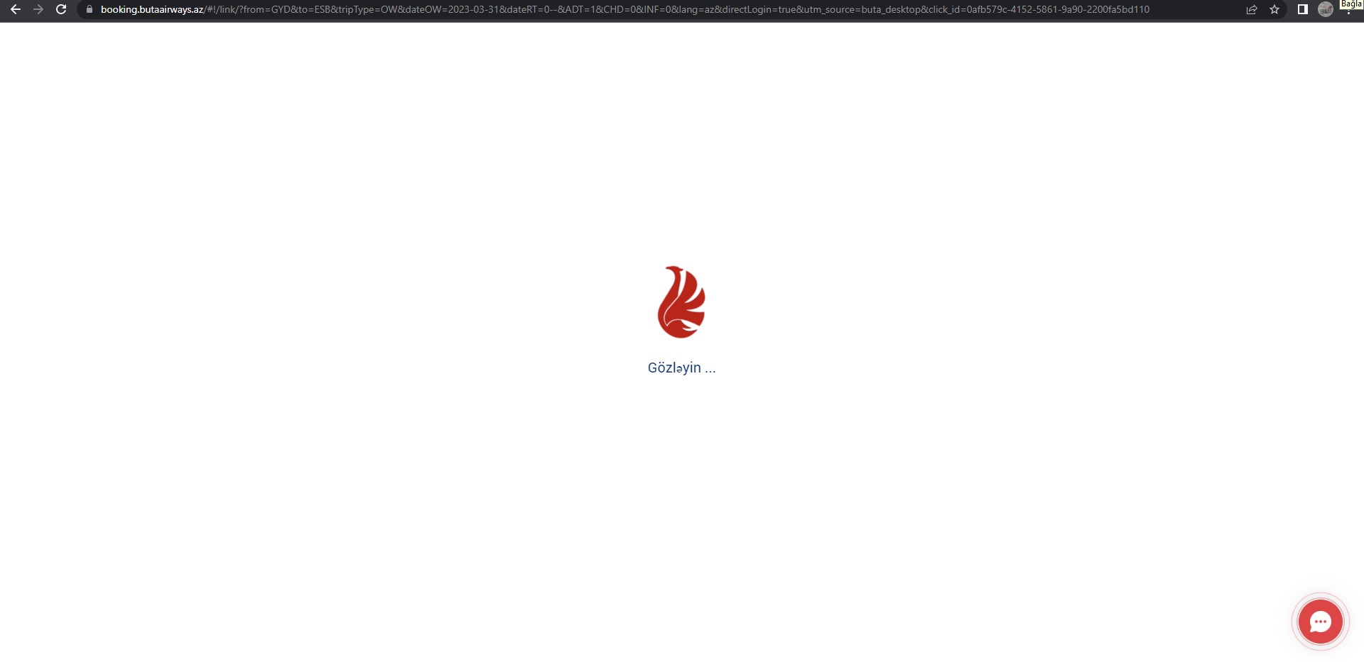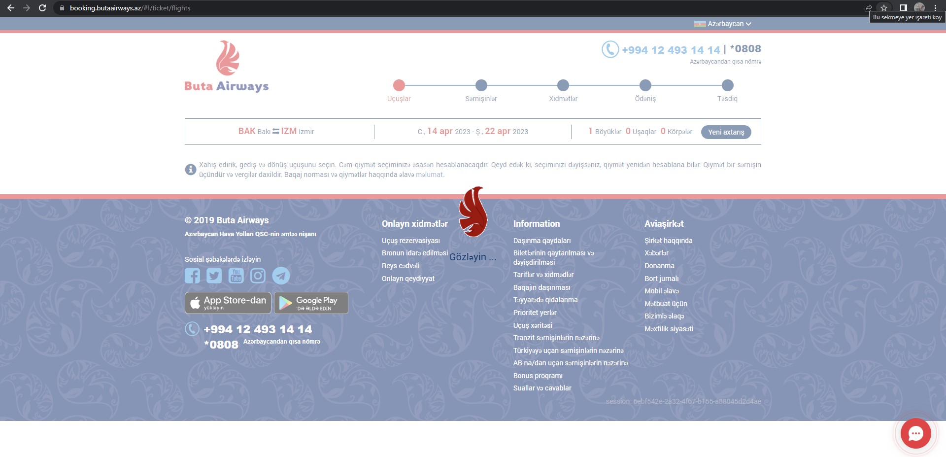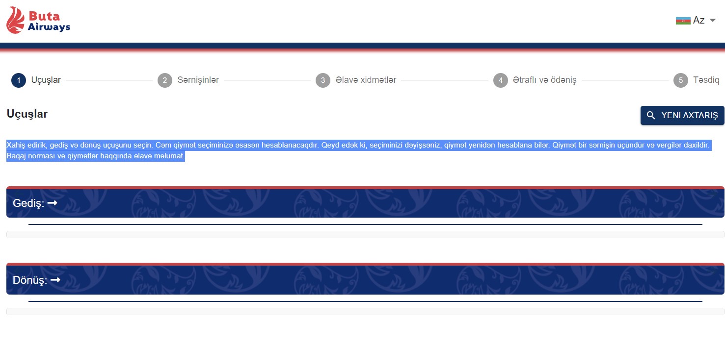 Xeyli müddət "Gözləyin" yazıldıqdan sonra, ekranda "Xahiş edirik, gediş və dönüş uçuşunu seçin. Cəmi qiymət seçiminizə əsasən hesablanacaqdır. Qeyd edək ki, seçiminizi dəyişsəniz, qiymət yenidən hesablana bilər. Qiymət bir sərnişin üçündür və vergilər daxildir" yazılar, lakin "Gediş" və "Dönüş" barədə məlumatlar göstərilmir.