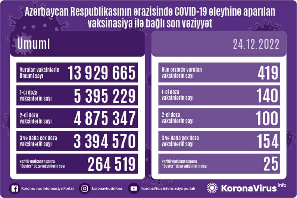 Azərbaycanda son sutkada koronavirus (COVID-19) əleyhinə 419 vaksin vurulub.Bir gündə birinci mərhələ üzrə vaksinasiya olunanların sayı 140, ikinci mərhələ üzrə vaksinasiya olunanların sayı 100, üç və daha çox doza vaksin vurduranların sayı 154, pozitiv nəticədən sonra buster doza üzrə vaksinasiya olunanların sayı isə 25 nəfərdir.