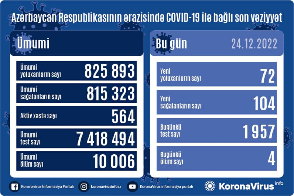 Azərbaycanda koronavirus (COVID-19) infeksiyasına 72 yeni yoluxma faktı qeydə alınıb, 104 nəfər müalicə olunaraq sağalıb.