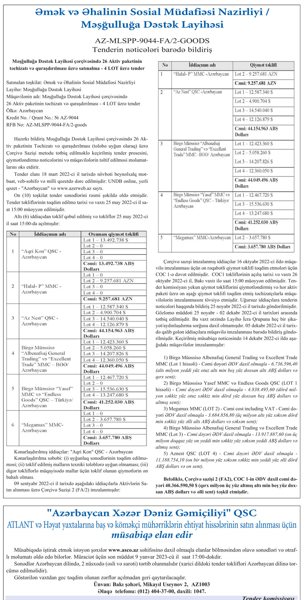 Əmək və Əhalinin Sosial Müdafiəsi Nazirliyi Məşğulluğa Dəstək Layihəsi tenderinin nəticələrini açıqlayıb.