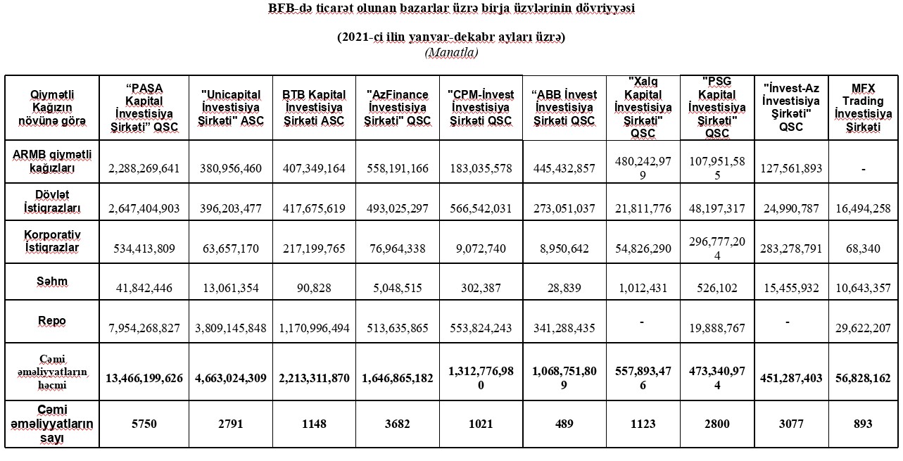 Marja.az Birja-ya istinadən xəbər verir ki, 2022-ci ilin yanvar-dekabr ayları ərzində 10 milyard 615 milyon 887 min 263 manat dövriyyə ilə“PAŞA Kapital İnvestisiya Şirkəti” QSC birinci, 4 milyard 264 milyon 72 min 581 manat dövriyyə ilə "CPM-İnvest İnvestisiya Şirkəti" QSC 2-ci, 3 milyard 315 milyon 722 min 520 manat dövriyyə ilə "Unicapital İnvestisiya Şirkəti" ASC 3-cü yeri tutub.