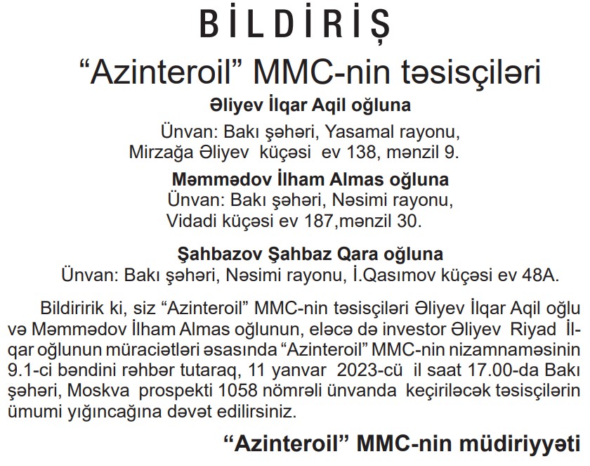 “Azinteroil” MMC-nin müdiriyyəti, şirkətin təsisçiləri Əliyev İlqar Aqil oğlunun, Məmmədov İlham Almas oğlunun, eləcə də investor Əliyev Riyad İlqar oğlunun müraciətləri əsasında təsisçilərin ümumi yığıncağını çağırıb.