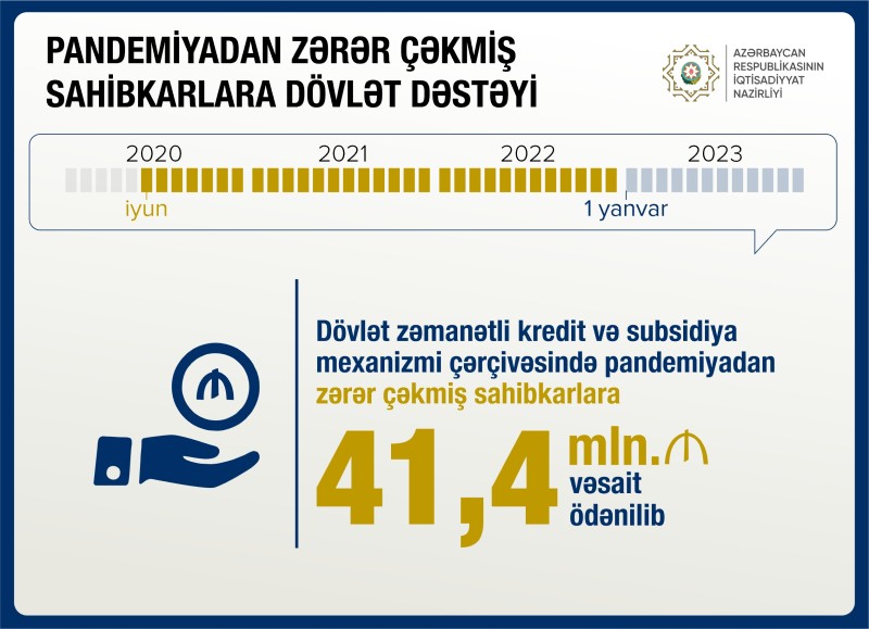 Pandemiyadan zərər çəkmiş sahibkarlara 2020-ci ilin iyun ayından bu il yanvarın 1-dək dövlət zəmanətli kredit və subsidiya mexanizmi çərçivəsində 41,4 milyon manat vəsait ödənilib.