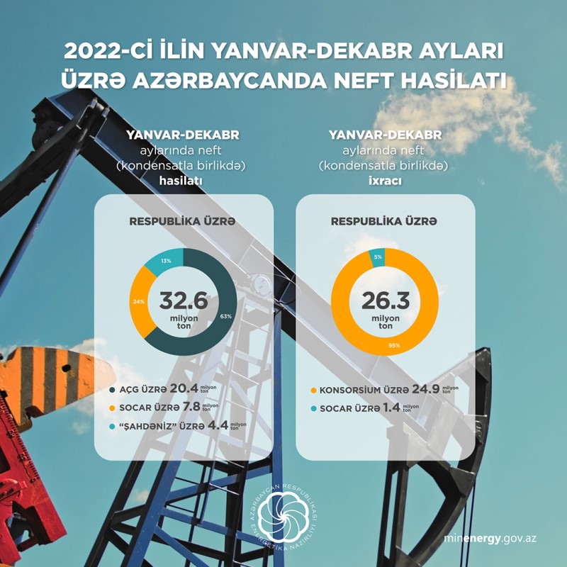 2022-ci ilin yanvar-dekabr aylarında ölkədə 32,6 milyon ton neft (kondensatla birlikdə) hasil edilib. Respublika üzrə neft hasilatının 20,4 milyon tonu “Azəri-Çıraq-Günəşli”nin, 4,4 milyon tonu (kondensat) “Şahdəniz”in payına düşüb. SOCAR üzrə neft (kondensatla birlikdə) hasilatı 7,8 milyon ton təşkil edib.