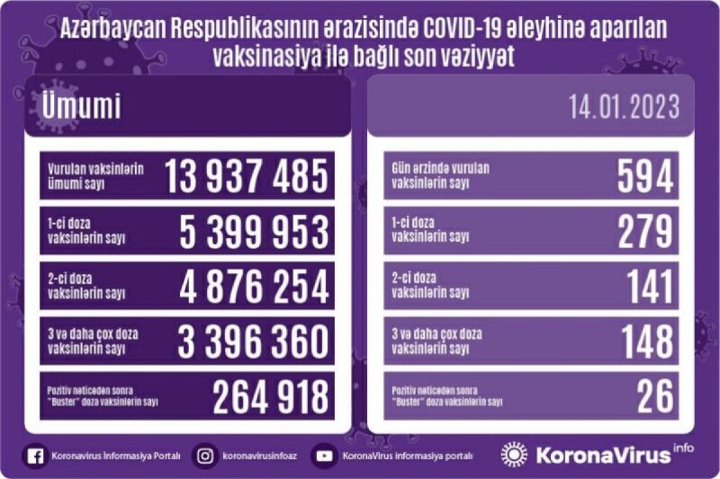 Azərbaycanda son sutkada koronavirus (COVID-19) əleyhinə 594 vaksin vurulub. Bir gündə birinci mərhələ üzrə vaksinasiya olunanların sayı 279, ikinci mərhələ üzrə vaksinasiya olunanların sayı 141, üç və daha çox doza üzrə vaksinasiya olunanların sayı 148, pozitiv nəticədən sonra buster doza üzrə vaksinasiya olunanların sayı 26 nəfərdir.