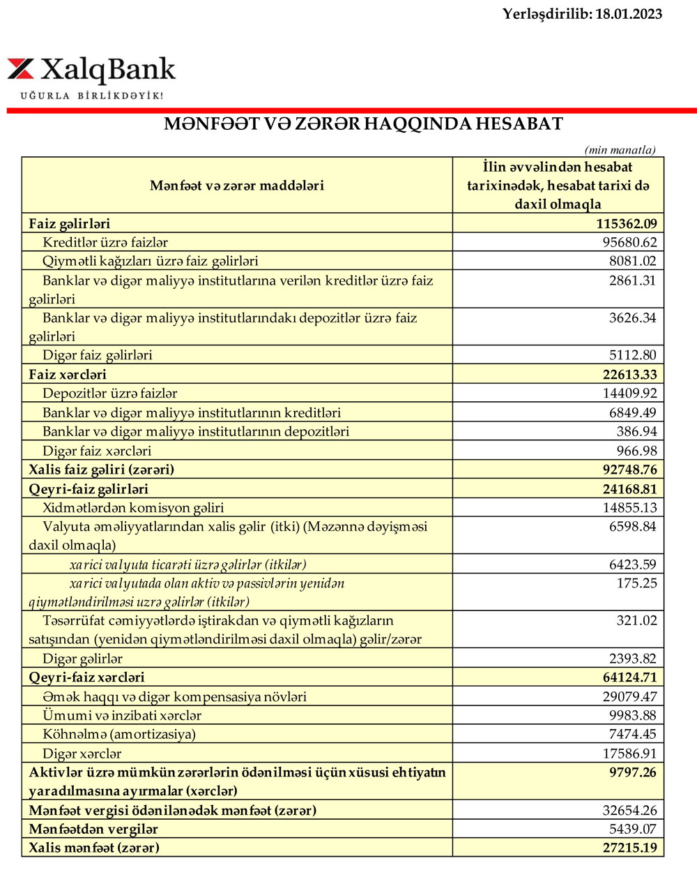 Marja.az xəbər verir ki, Xalq Bank 2022-ci ili 27 milyon 215 min manat xalis mənfəət ilə başa vurub. Bank 2021-ci ili 27 milyon 289 min manat xalis mənfəət ilə bağlamışdı. Beləliklə, Xalq Bankın xalis mənfəəti 2021-ci illə müqayisədə 2022-ci ildə təxminən eyni səviyyədə olub.