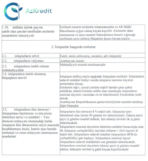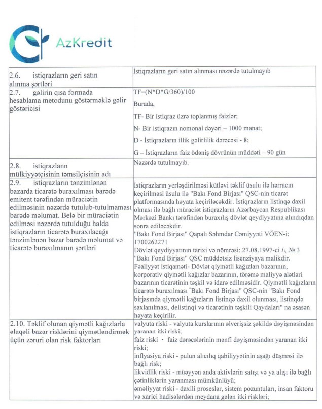 Marja.az xəbər verir ki, kredit təşkilatı hər birinin nominal dəyəri 1000 manat olan 500 ədəd faizli, təmin edilməmiş istiqraz buraxır. İstiqrazlar üzrə faiz dərəcəsi illik 8%, tədavül müddəti 1 ildir. Faizlər 90 gündən bir ödəniləcəkdir.