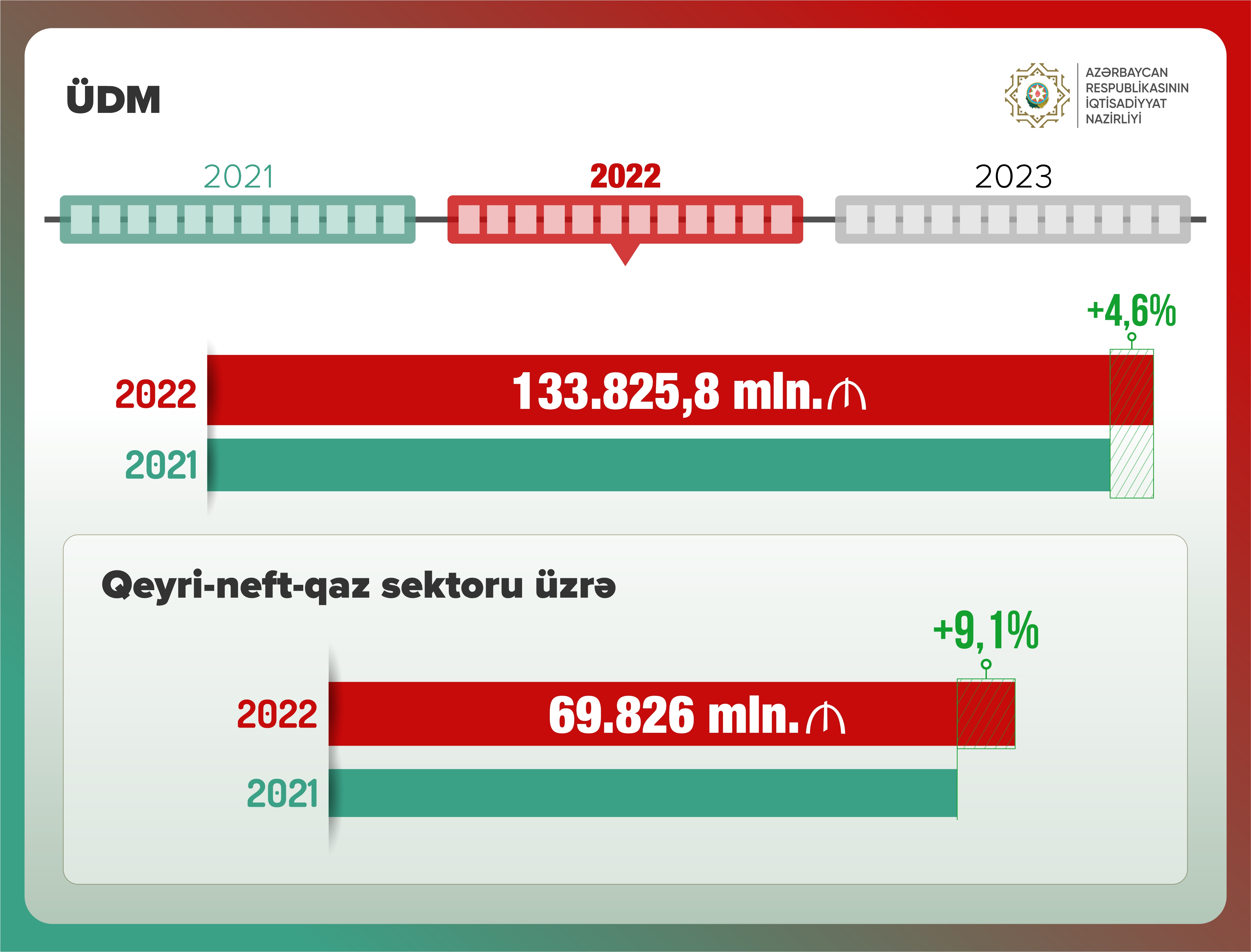 İqtisadiyyat naziri Mikayıl Cabbarov Tvitter səhifəsində yazıb ki, 2022-ci ildə ÜDM 2021-ci ilə nisbətən 4,6% artaraq 133 milyard 825,8 milyon manat, qeyri-neft-qaz sektorunda isə 9,1% artaraq 69 milyard 826 milyon manat təşkil edib.