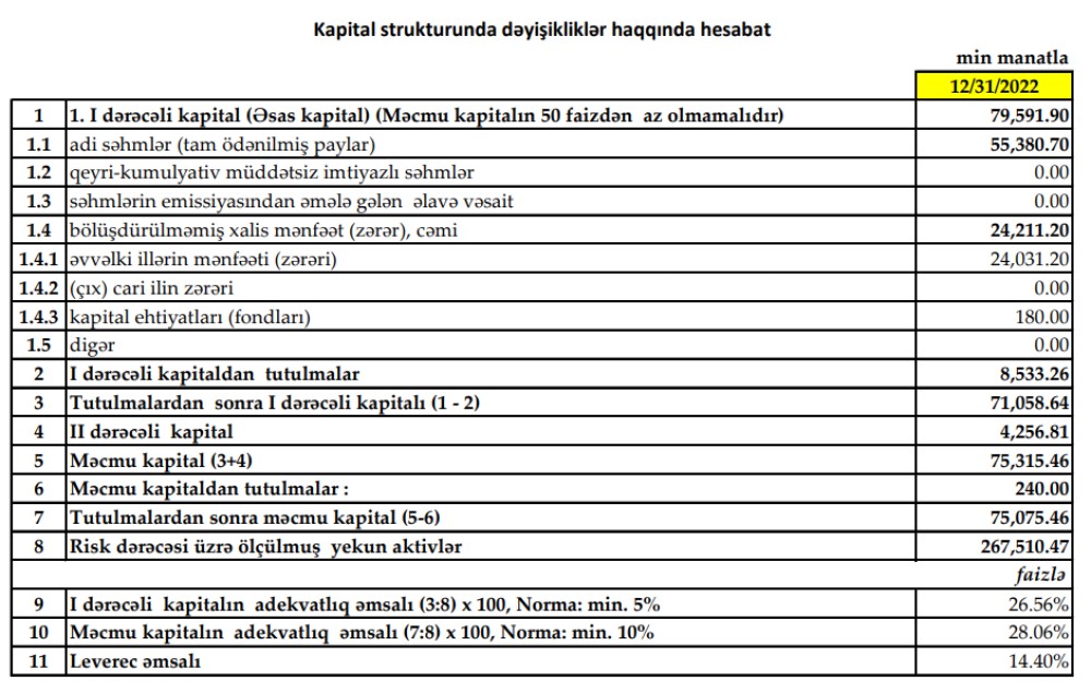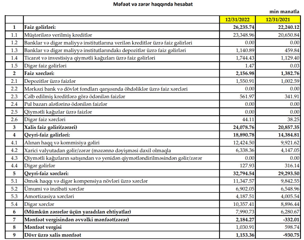 Qeyd edilib ki. ötən il ilə müqayisədə Bankın faiz gəlirləri 18% artaraq 26.2 milyon manat, qeyri-faiz gəlirləri 31.3% artaraq 18.9 milyon manat təşkil edib. Ümumilikdə isə, Bank 2022-ci ili 24.1 milyon manat xalis faiz gəliri ilə başa vurub.