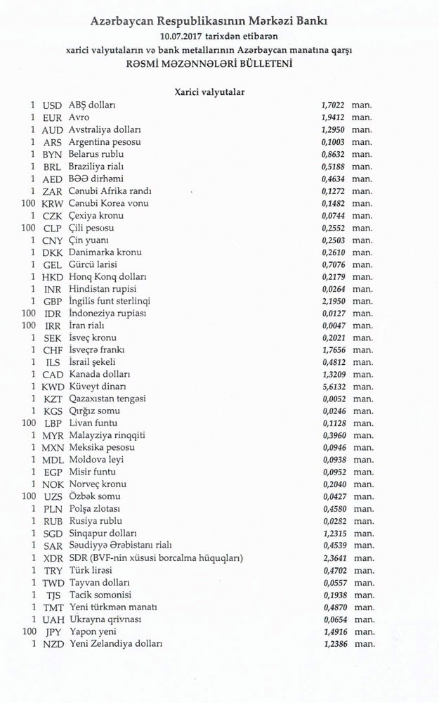 AZN məzənnələri açıqlandı