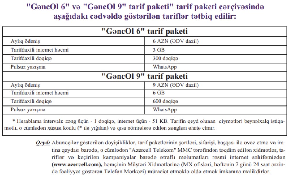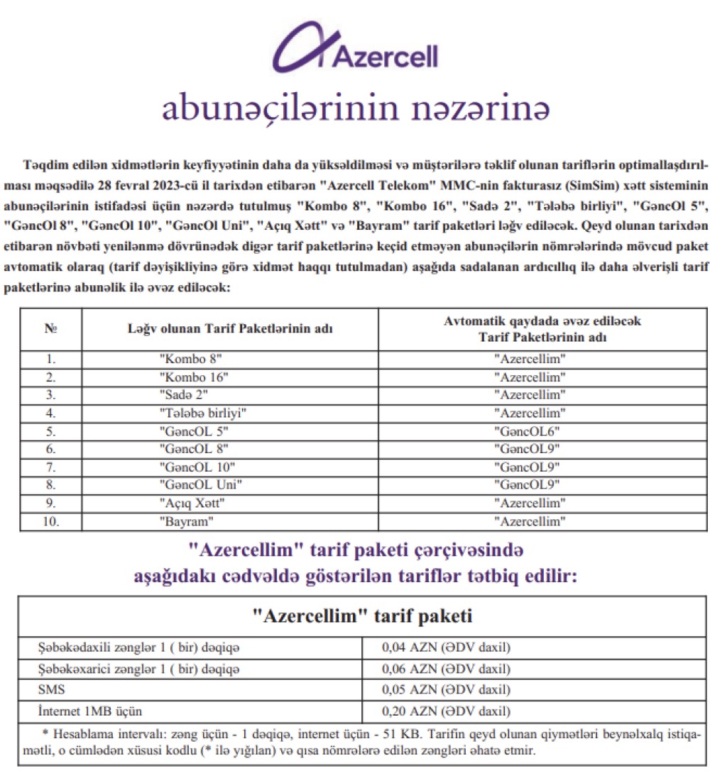 Eyni zamanda, 28.02.2023-cü il tarixdən etibarən "Azercell Telekom" MMC-nin fakturalı xətt sistemində korporativ abunəçilərə təqdim edilən "Socar 20", "Socar 50", "Socar 100", "50 SMS", "100 SMS", "200 SMS", "250 SMS", "500 SMS" SMS paketlərinə və "Biznes 25 (illik)" paketinə yeni qoşulmalar dayandırılacaq. Göstərilən tarixədək paketlərə qoşulan abunəçilər müvafiq istifadə müddəti bitənədək paketlərdən istifadəyə davam edə biləcəklər.