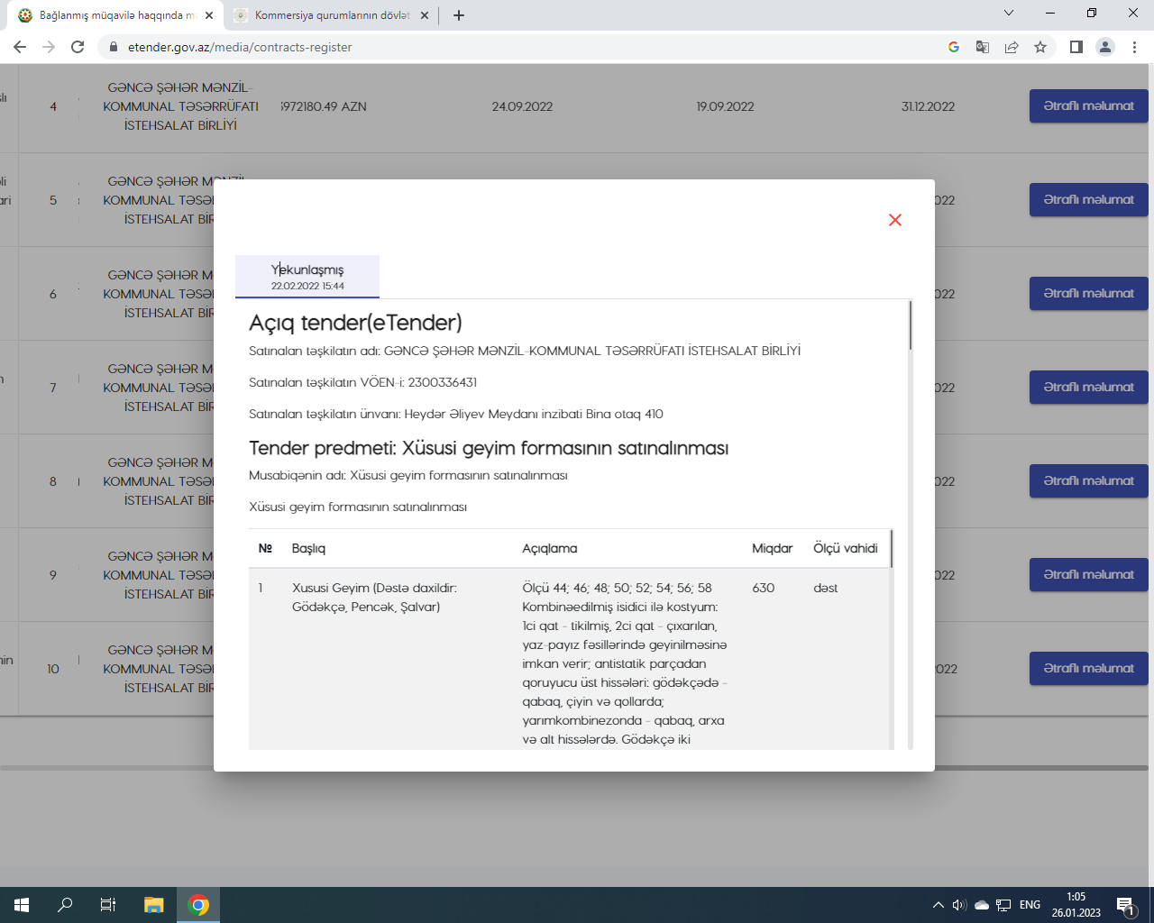 Tender məlumatlarına baxdıqda məlum olur ki, işçilərin xüsusi geyimlərlə təminatı ilə bağlı Gəncə MKTİB 2020-ci ildən bu günə qədər 3 dəfə - 31.12.2020, 31.03.2022, 31.12.2022 tarixlərində - tender keçirdib. İki tenderdə “LK Machinery” MMC, bir tenderdə isə “Abşeron Tekstil” MMC qalib olublar.