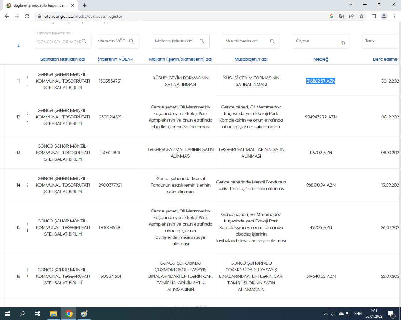 "Mən vətəndaş olaraq “Facebook” sosial şəbəkəsində Gəncə şəhər Mənzil Kommunal Təsərrüfat İstehsalat Birliyinin (Gəncə MKTİB) “facebook” səhifəsinə yazaraq Gəncədə MKTİB-in küçə təmizliyi ilə məşğul olan işçilərinin isti qış geyimləri ilə hansı səbəbdən təmin olunmadıqları, soyuqda həmin işçilərin necə gəldi geyindiklərini irad tutdum. Bu iradıma cavab olaraq Gəncə MKTİB tərəfindən mən barəmdə hüquq-mühafizə orqanlarının ölçü götürəcəyi ilə bağlı hədələndim və səhifəyə girişim bloklandı. Mən Gəncə MKTİB tərəfindən işçilərinin geyim təminatı ilə bağlı müstəqil araşdırma apardım və www.etender.gov.az portalı üzərindən sorğu verərək Gəncə MKTİB-in keçirdiyi tenderlərə baxdım. Maraqlı məlumatlar əldə etdim və onları ölkə ictimaiyyətinə sizin sayt vasitəsi ilə təqdim edirəm.