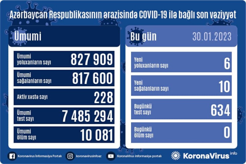 Azərbaycan Respublikasında koronavirus (COVID-19) infeksiyasına 6 yeni yoluxma faktı qeydə alınıb, 10 nəfər müalicə olunaraq sağalıb.