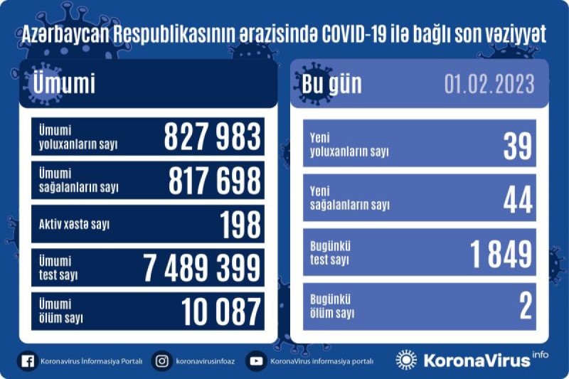 Azərbaycan Respublikasında koronavirus (COVID-19) infeksiyasına 39 yeni yoluxma faktı qeydə alınıb, 44 nəfər müalicə olunaraq sağalıb.