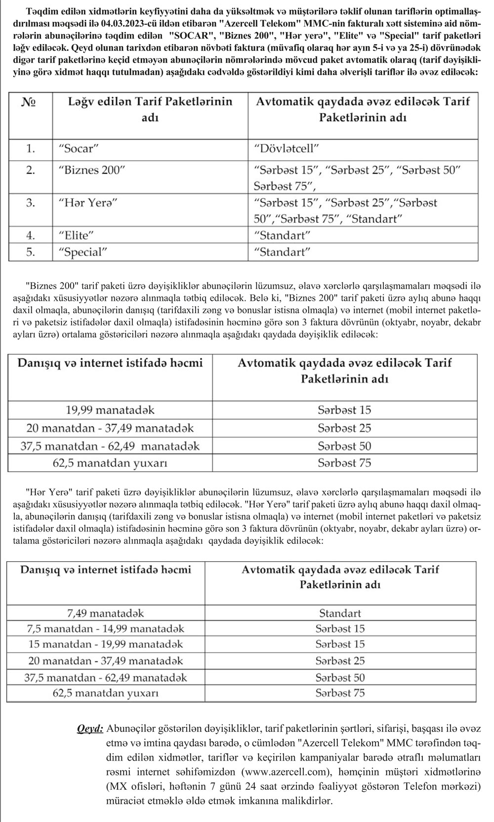 04 Mart 2023-cü il tarixindən "Azercell Telekom" MMC-nin fakturalı xətt sisteminə aid nömrələrin abunəçilərinə təqdim edilən "SOCAR", "Biznes 200", "Hər yerə", "Elit" və "Special" tarifləri ləğv ediləcək.