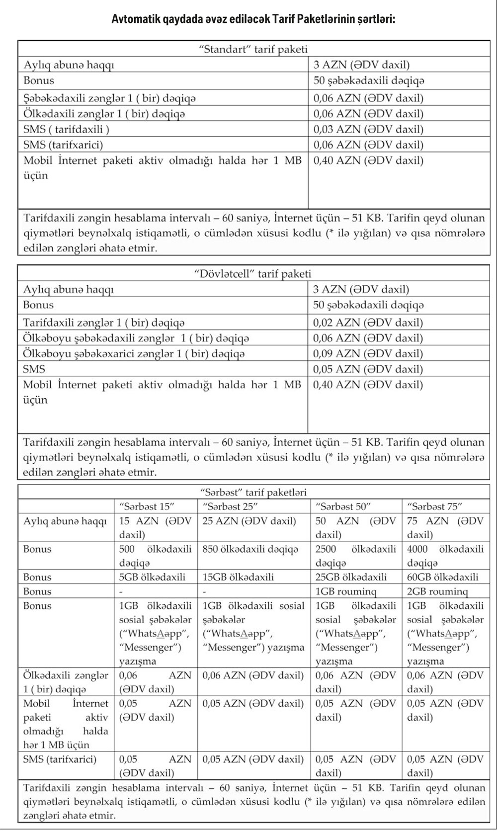 Marja.az xəbər verir ki, ləğv edilən tarif paketləri aşağıdakı yeni tarif paketləri ilə əvəzlənəcək.