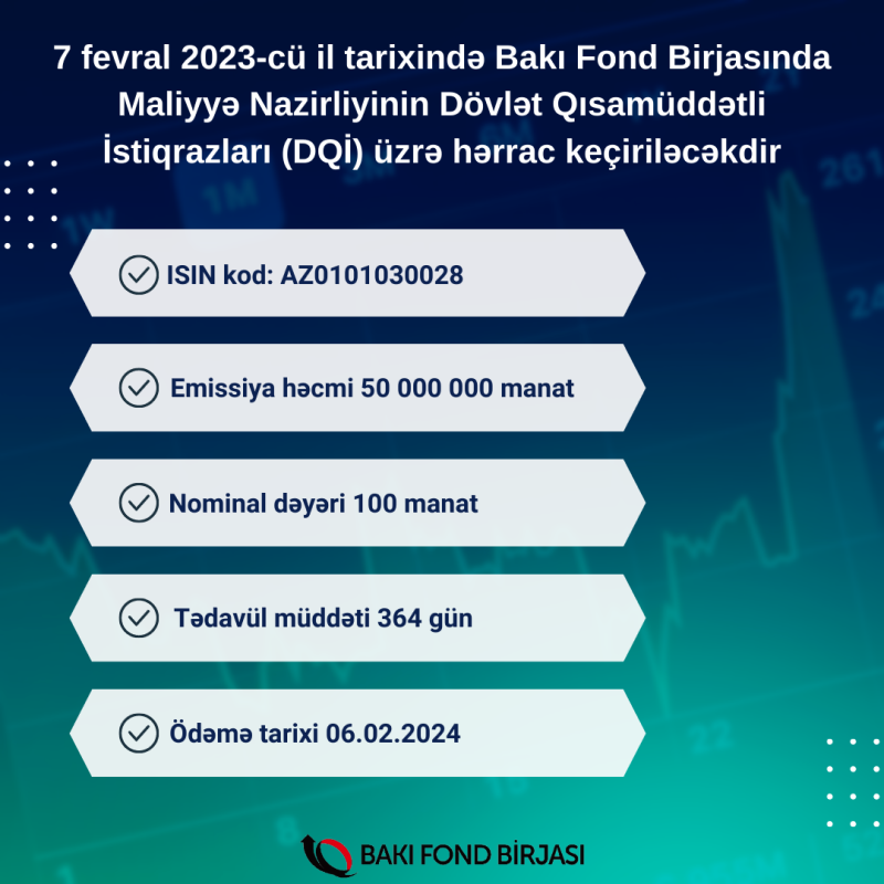 7 fevral 2023-cü il tarixində Bakı Fond Birjasında Maliyyə Nazirliyinin 50 milyon manatlıq Dövlət Qısamüddətli İstiqrazları (DQİ) üzrə hərrac keçiriləcəkdir.