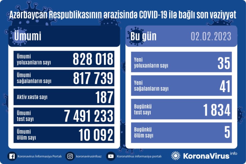 Azərbaycan Respublikasında koronavirus (COVID-19) infeksiyasına 35 yeni yoluxma faktı qeydə alınıb, 41 nəfər müalicə olunaraq sağalıb.