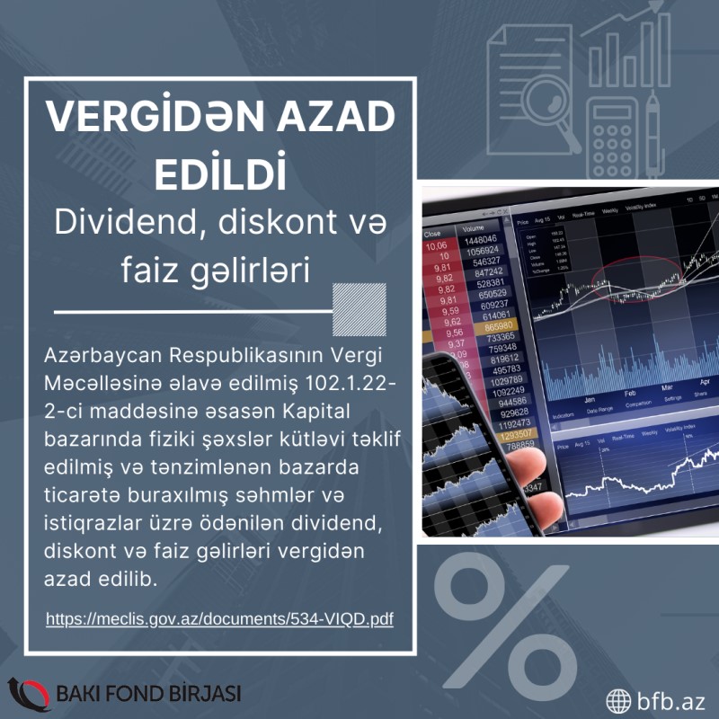 09 iyun 2022-ci il tarixində “Vergi Məcəlləsində dəyişiklik edilməsi haqqında Azərbaycan Respublikasının Qanun”u qəbul edilmiş qanuna əsasən Azərbaycan Respublikasının Vergi Məcəlləsinə 102.1.22-2-ci maddə əlavə edilmişdir. Bu maddə 2023-cü il fevralın 1-dən etibarən fiziki şəxslərin yalnız kütləvi təklif edilmiş və tənzimlənən bazarda ticarətə buraxılmış səhmlər və istiqrazlar üzrə müvafiq olaraq ödənilən dividend, diskont (istiqrazların nominalından aşağı yerləşdirilməsi nəticəsində yaranmış fərq) və faiz gəlirlərinin 5 il müddətinə vergidən azad edilməsini nəzərdə tutur.