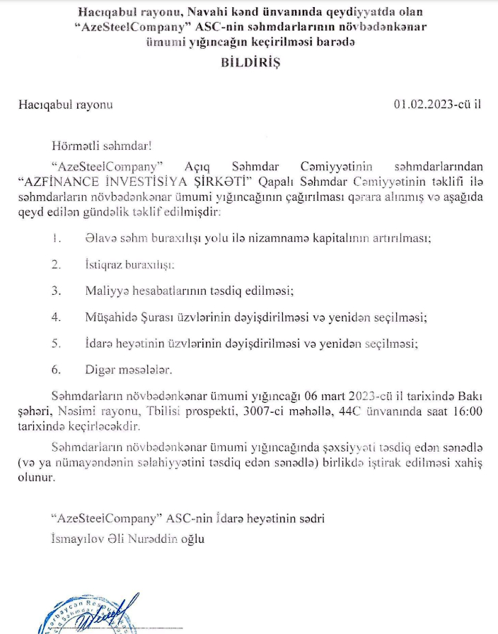 Martın 6-sında “AzeSteelCompany” ASC-nin səhmdarlarının növbədənkənar ümumi yığıncağı keçiriləcək.