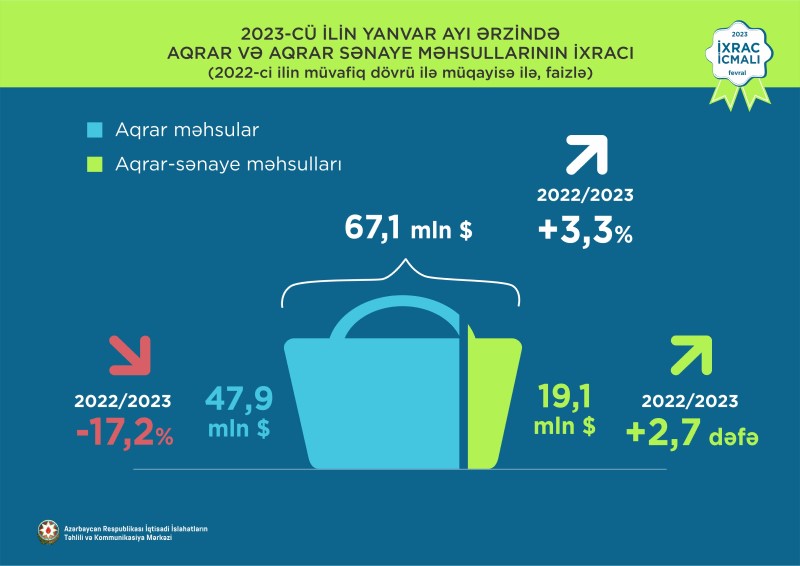 İqtisadi İslahatların Təhlili və Kommunikasiya Mərkəzinin yaydığı məlumata görə, qeyri-neft sektoru üzrə ixrac 2022-ci ilin müvafiq dövrü ilə müqayisədə 22,6% artıb. 2023-cü ilin yanvar ayı ərzində yeyinti məhsulları üzrə ixrac 64,3 milyon ABŞ dolları, qeyri-yeyinti məhsulları üzrə isə 220,2 milyon ABŞ dollarına bərabər olub.