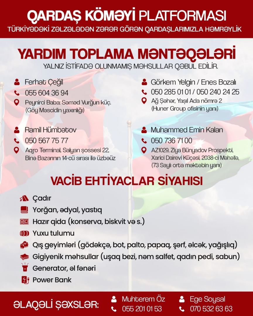 MÜSİAD Azərbaycan, ATİB, TUİB, Azərbaycan Sahibkarlar Konfederasiyası, Türkiyə Universitetləri Məzunları İctimai Birliyi, Azərbaycan Əczaçılar Klubu, Gəncliyə Yardım Fondu, Müasir İnkişaf Birliyi, KOBSKA, Türkiyə Məzunu Ziyalılar və İş Adamları Platformu, Tərxis Olunmuş Hərbçilərin Gəncləri Maarifləndirmə Birliyi və KOBİA təmsilçisinin də iştirakı ilə təsis edilən "Qardaş Köməyi" platforması Türkiyəyə zəlzələ bölgəsinə göndəriləcək malların adlarını açıqlayıb.