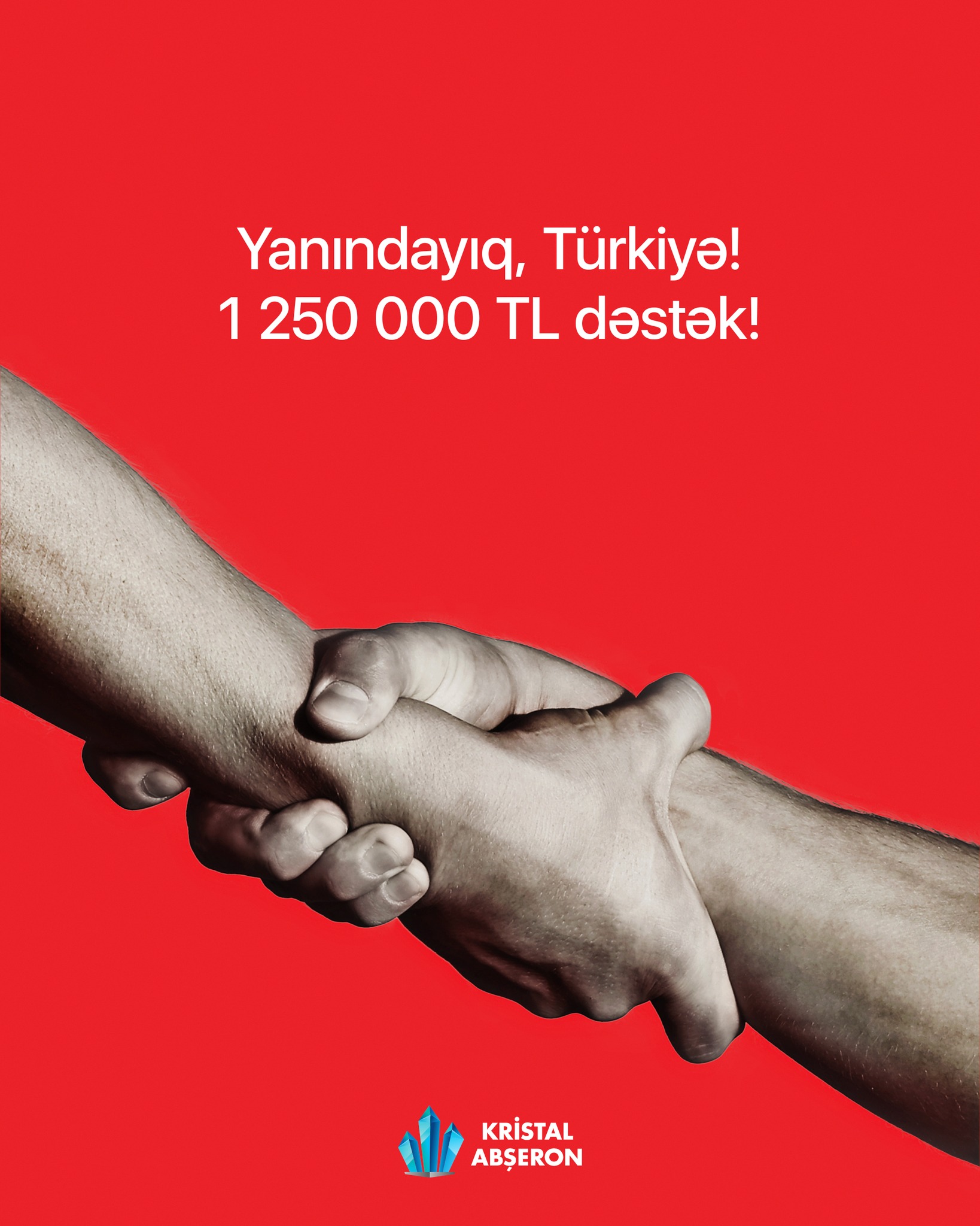 Davam edən axtarış və xilasetmə əməliyyatlarına Kristal Abşeron olaraq öz dəstəyimizi göstərmək adına T.C. İçişleri Bakanlığı Afet ve Acil Durum Yönetimi Başkanlığı - AFAD-a 600 000 TL ianə etdik və 650 000 TL dəyərində isə Türkiyədən qida məhsulları, Azərbaycandan isə bir sıra zəruri ləvazimatlar (çadır, yataq dəstləri və çarpayı, masa, oturacaq, qızdırıcı və s.) alaraq zəlzələ bölgəsinə göndəririk.