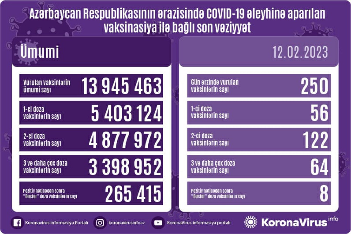 Azərbaycanda son sutkada koronavirus (COVID-19) əleyhinə 250 vaksin vurulub. Bir gündə birinci mərhələ üzrə vaksinasiya olunanların sayı 56, ikinci mərhələ üzrə vaksinasiya olunanların sayı 122, 3-cü və daha çox doza üzrə vaksinasiya olunanların sayı 64, pozitiv nəticədən sonra buster doza olunanların sayı isə 8 nəfərdir.