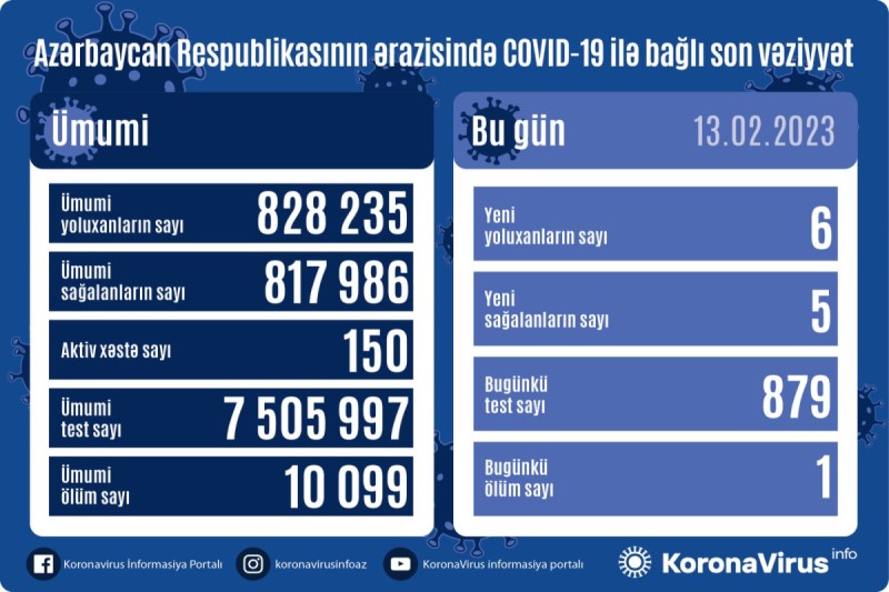 Azərbaycan Respublikasında koronavirus (COVID-19) infeksiyasına 6 yeni yoluxma faktı qeydə alınıb, 5 nəfər müalicə olunaraq sağalıb.