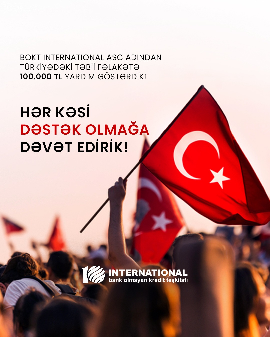 BOKT "İNTERNATİONAL" ASC qardaş Türkiyədə baş vermiş dəhşətli zəlzələdən zərər çəkənlərə yardım məqsədilə Türkiyənin Daxili İşlər Nazirliyinin Təbii Fəlakət və Fövqəladə Hallar Agentliyinin (AFAD) fonduna 100 000 TL (türk lirəsi) ianə edib.